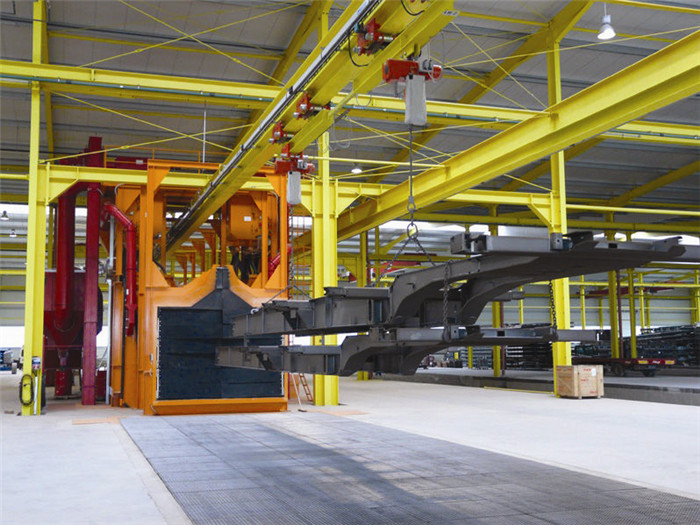 大型吊钩通过式抛丸机采用双吊钩组成的吊钩组来吊挂工件,一般适用于工件比较长,尺寸比较大的情况,如挖掘机的动臂、推土机机身、大型机床床身等。