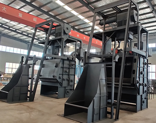 履带式抛丸机用橡胶履带形成的凹腔作为工件承载体。工作时,履带转动,带动凹腔内的工件翻滚,因此零件的内外表面均能获得较好的清理效果。该种机型分为手动和自动装卸料方式,适合于大批量小型零件的抛丸清理。由于采用橡胶履带,减轻了工件与履带的撞击和划痕,并且占地面积小,操作极为方便,从而为众多厂家采用。